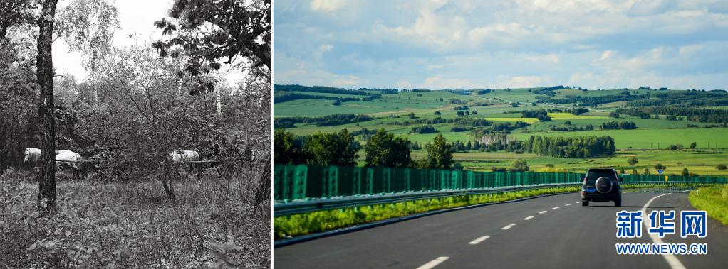 拼版照片:左Bentley零件圖為1954年拍攝的穿行在林間的年夜轱轆車奧迪零件(資料照片,鄂倫春自治旗供圖);右圖為2021年8月6日,汽車行駛在鄂倫春自治旗境內的G332國道上(新華社記者連振攝)。